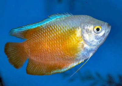 specimens are sometimes available. Peaceful towards other species of fish, however, males may become territorial towards other Dwarf Gouramis when kept together in smaller tanks. A well-planted aquarium with a gentle water