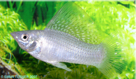 by the males’ continual amorous intentions. Suitable tankmates would include some of the medium sized Gouramis (Trichopodus species). Sailfin Mollies are available in a huge array of colour strains. The specimen featured in the above photograph is a ‘Silver’ variety.
